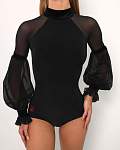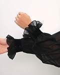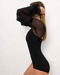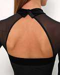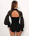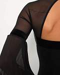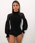 Эффектное черное боди с длинными рукавами-фонариками для спортивных бальных танцев и оригинальных образов от бренда PRIMABELLA. Бархатные акценты на манжетах, рукавах и воротнике.