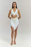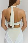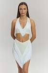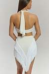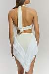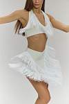 Дизайн делает эту модель эффектным акцентом любого образа. Белый цвет придает образу легкость и элегантность. Ключевым декоративным элементом является объёмная бахрома, пришитая клиньями спереди и сзади. При движении она создает многомерную динамику, захватывающий визуальный объем и подчеркивает каждый поворот, добавляя танцу особую выразительность и стиль. Материал сохраняет интенсивность цвета после множества стирок.