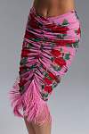 Вшитые трусики не позволят юбке перекручиваться во время выполнению любых танцевальных фигур. Драпировка по всей длине юбки придаёт объем и делает силуэт более привлекательным. Выполнена из сетчатого эластичного и мягкого материала. Комфортно фиксируется, благодаря резинке на поясе.