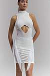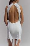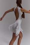 Женское белоснежное платье без рукавов от бренда PRIMABELLA — это воплощение страсти и динамики для латины и стандарта. Модель облегающего кроя идеально сидит по фигуре, благодаря фирменной эластичной ткани. Она обеспечивает полную свободу движений, легко стирается, быстро сохнет и сохраняет безупречную форму после множества использований. Эффектный дизайн с асимметричным вырезом на талии и открытой спиной подчеркивает сексуальность образа. Высокая горловина и застежка на крючок сзади обеспечивают удобную посадку. Пышная и густая бахрома добавляет каждому движению завораживающий визуальный объем, делая это платье идеальным выбором для победы на паркете. Вшитые бесшовные чашечки моделируют элегантные очертания груди и обеспечивают эффективную поддержку. Вшитые трусики не позволят плятью перекручиваться даже при выполнении самых активных танцевальных фигур.